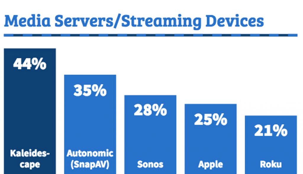 Media Servers/Streaming Devices — #3 with 28 percent marketshare, behind leaders Kaleidescape and Autonomic, both of which stream video as well as audio. If the category had been broken down by audio-only streaming devices, Autonomic would lead.