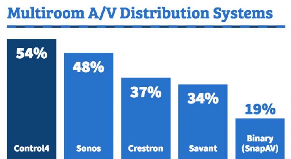 Multiroom A/V Distribution Systems — #2 overall (behind Control4) with a 48 percent penetration rate. This means that home systems integrators are putting in a lot of wireless multiroom audio systems these days, in addition to hardwired options.