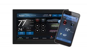 Aprilaire Model 8920W Wi-Fi Thermostat Aprilaire has a long background as a maker of smart thermostats, which are constructed with the latest technology and operate electronically (digitally) and control single-stage or multi-stage forced air, heat pump or hydronic HVAC systems. The Aprilaire WiFi Thermostat includes exclusive IAQ Control features to easily control all aspects of Indoor Air Quality via a simple app. It has a programmable touchscreen interface, and can also integrate with lighting, audio, video, security systems. Aprilaire claims the thermostat can save the average U.S. home $180 per year in energy costs. The thermostat is designed to be professionally installed.
